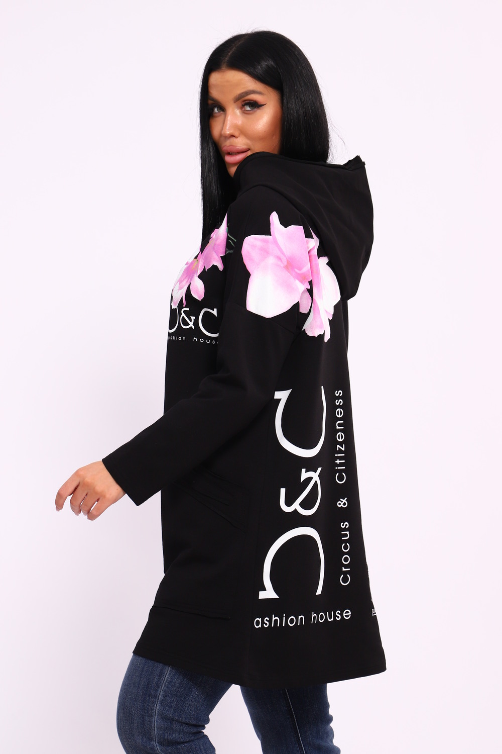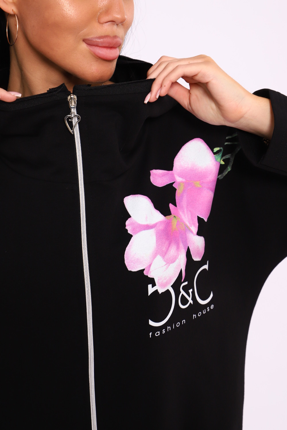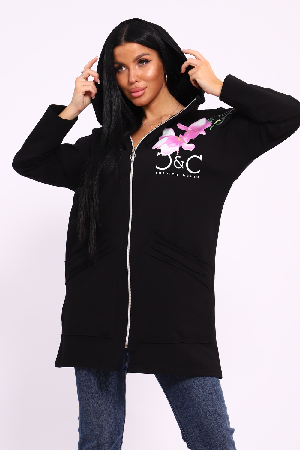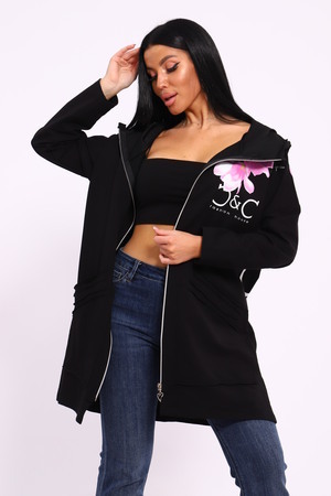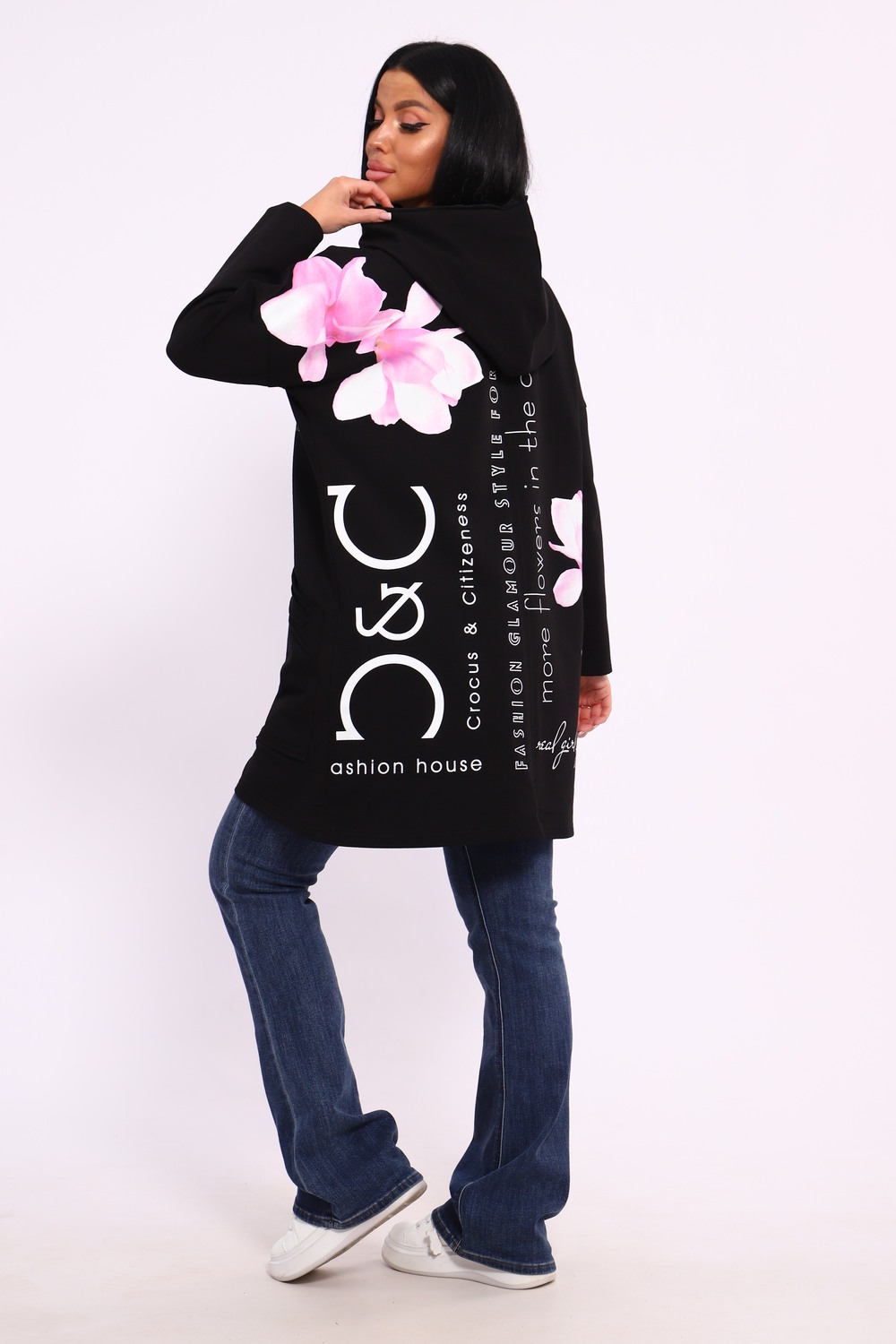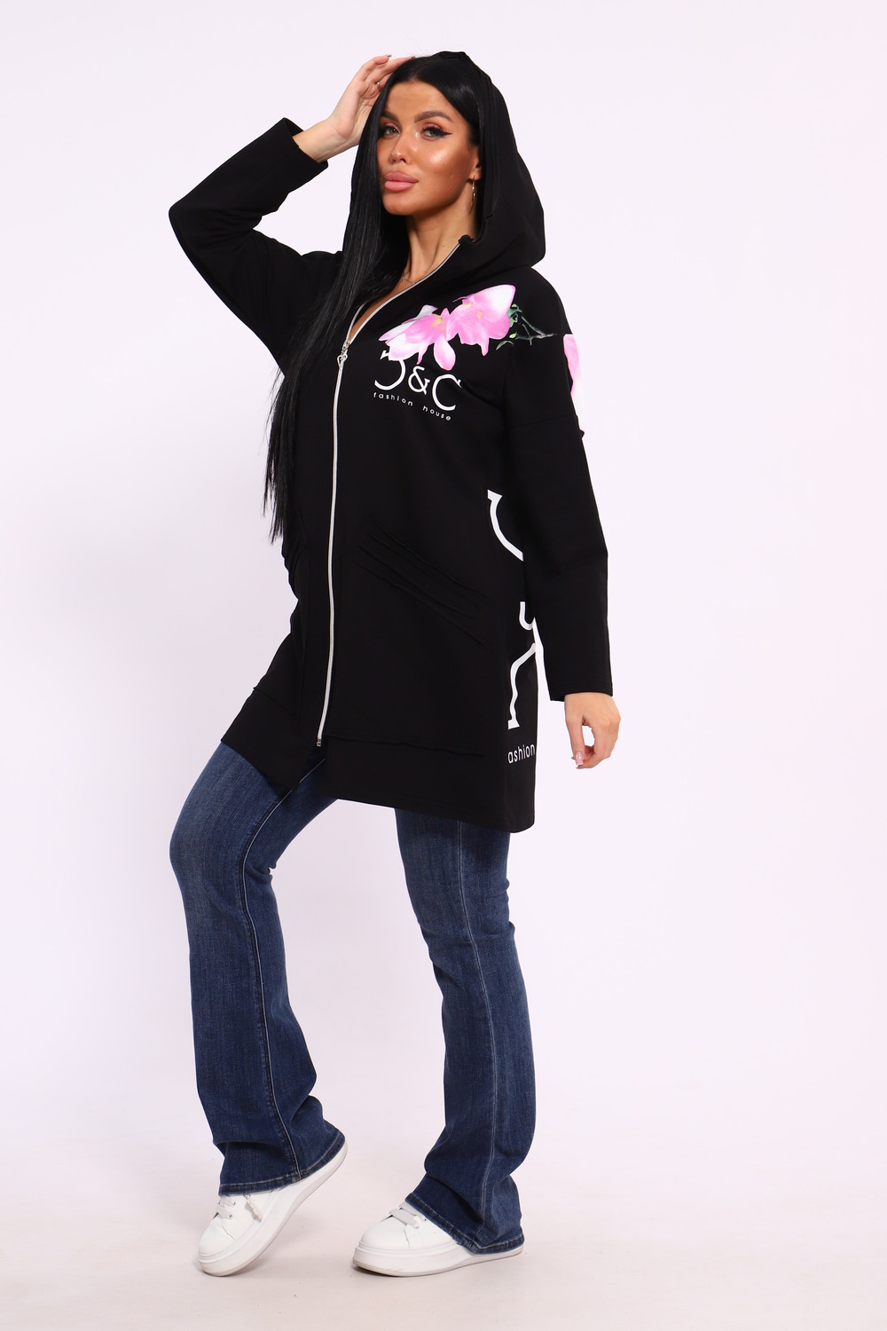 Женская туника из футера. Застегивается на молнию, по бокам карманы, имеется капюшон, принт в виде цветов и надписей, общая длина чуть выше коленей. Размеры от 50 до 64.