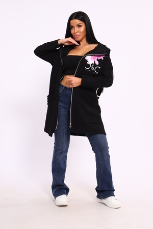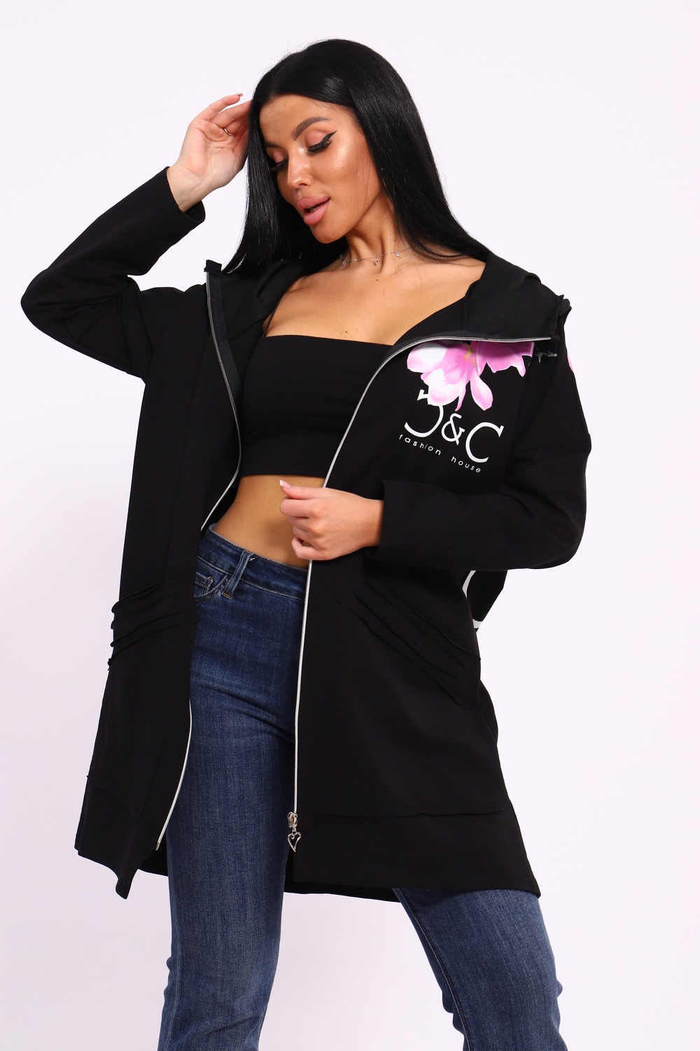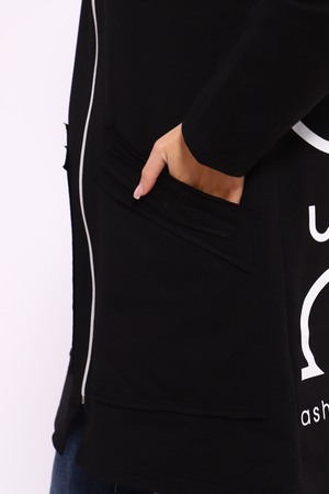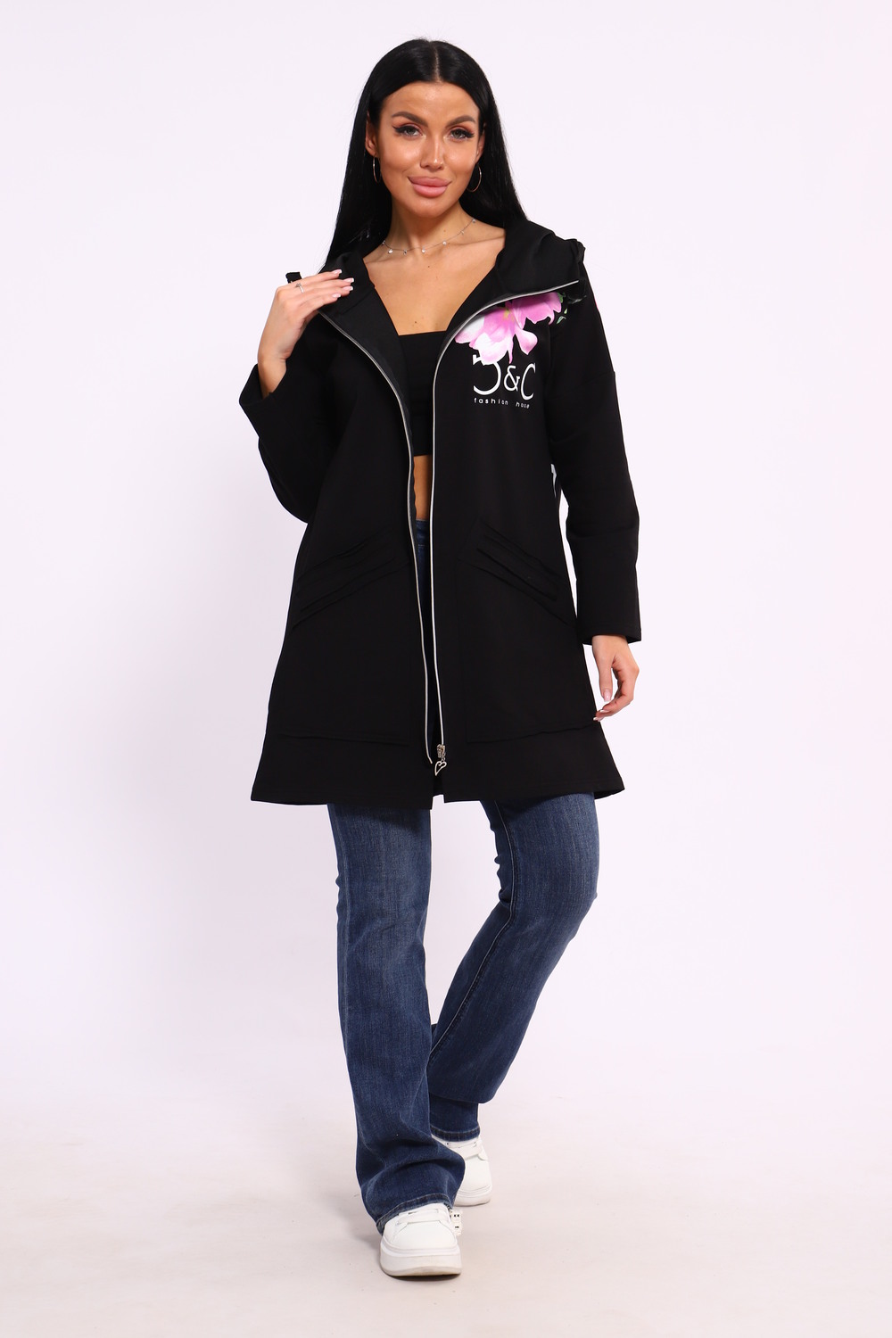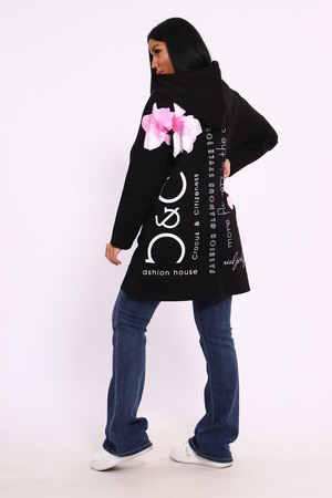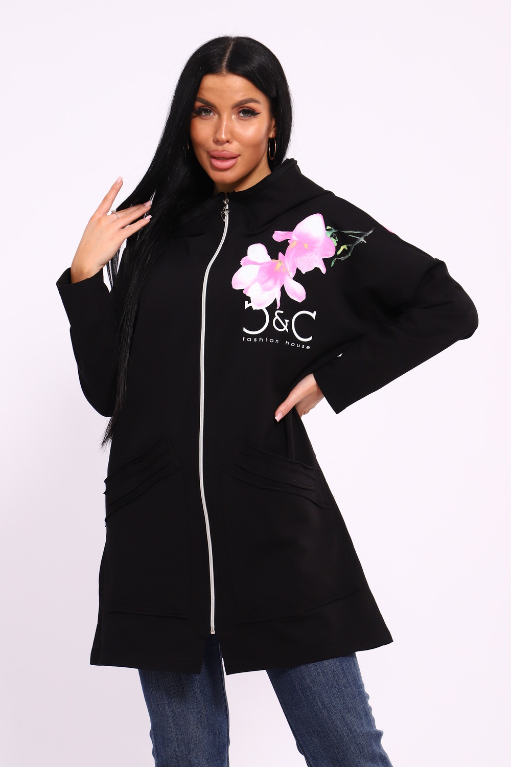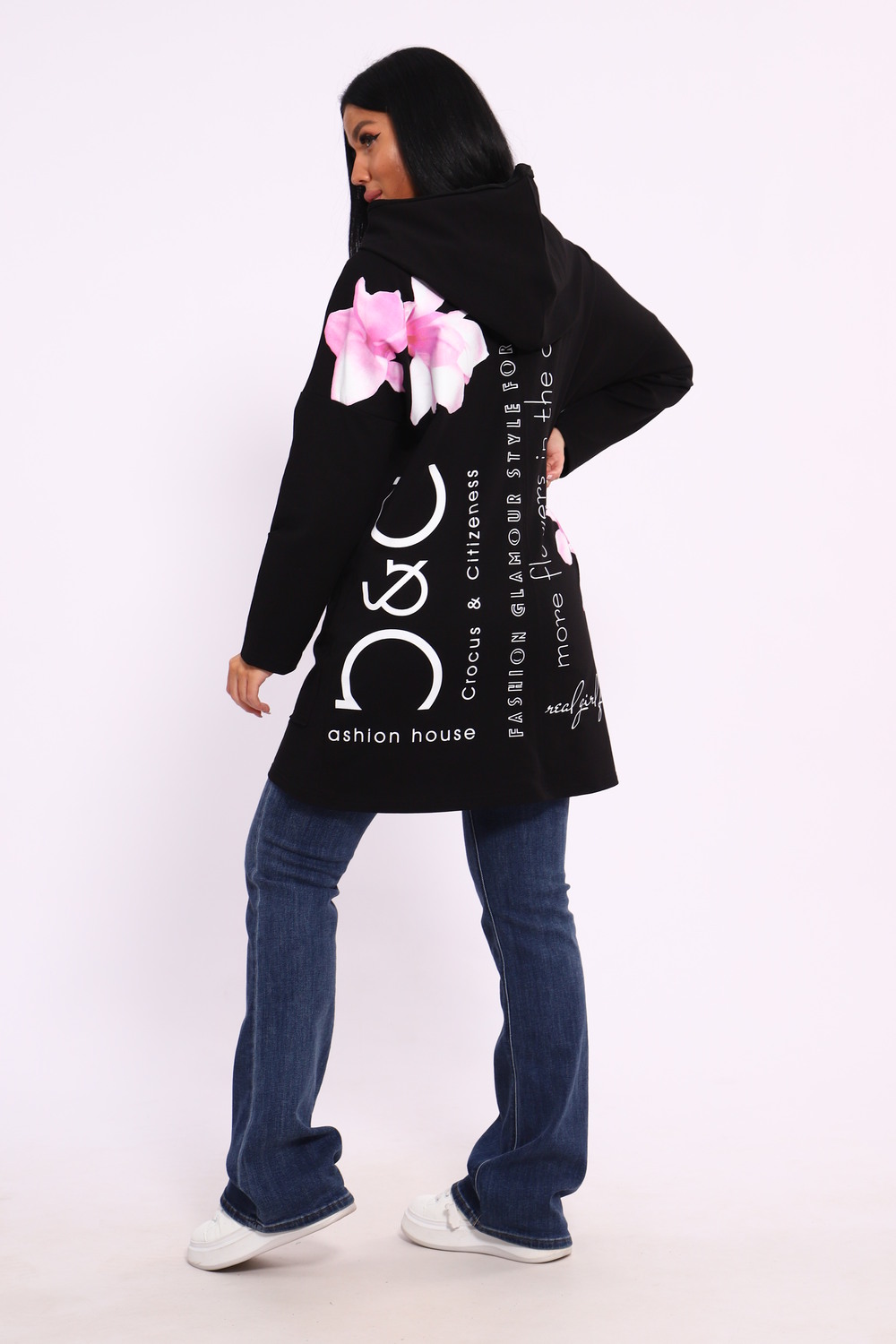 Женская туника из футера. Застегивается на молнию, по бокам карманы, имеется капюшон, принт в виде цветов и надписей, общая длина чуть выше коленей. Размеры от 50 до 64.
