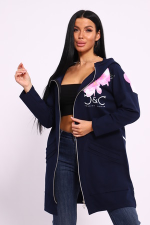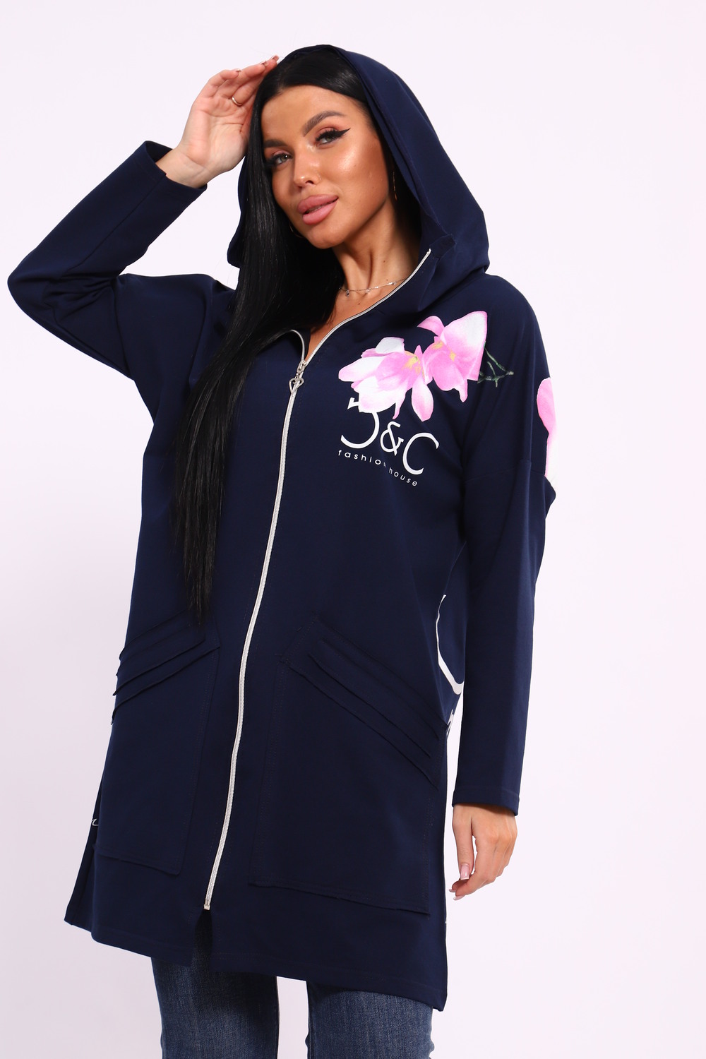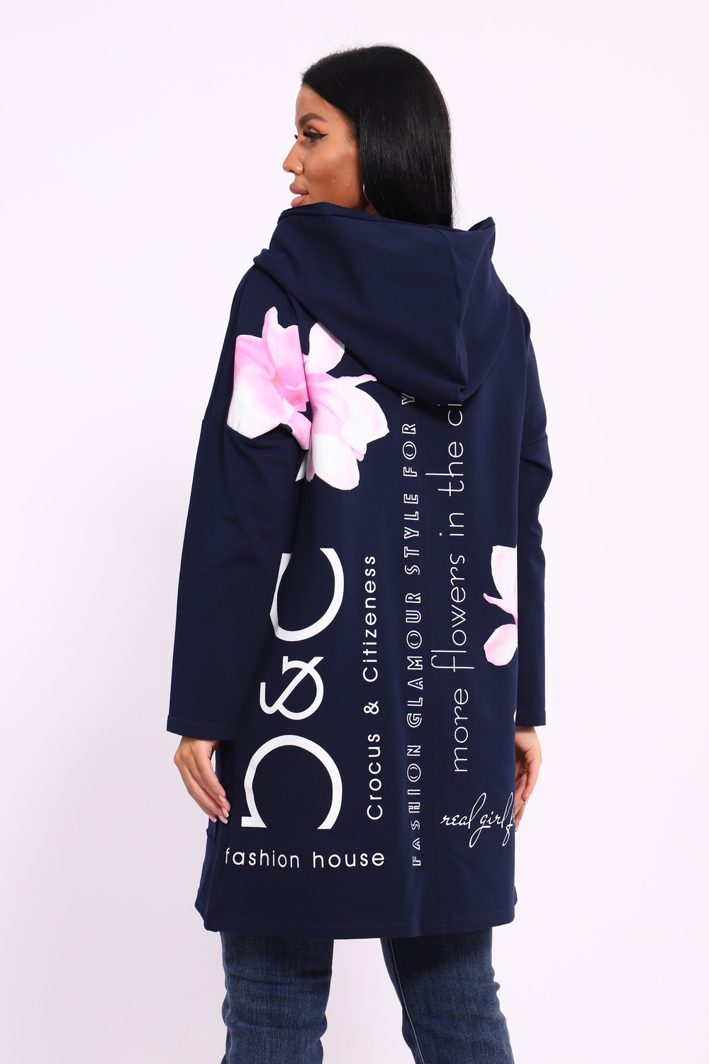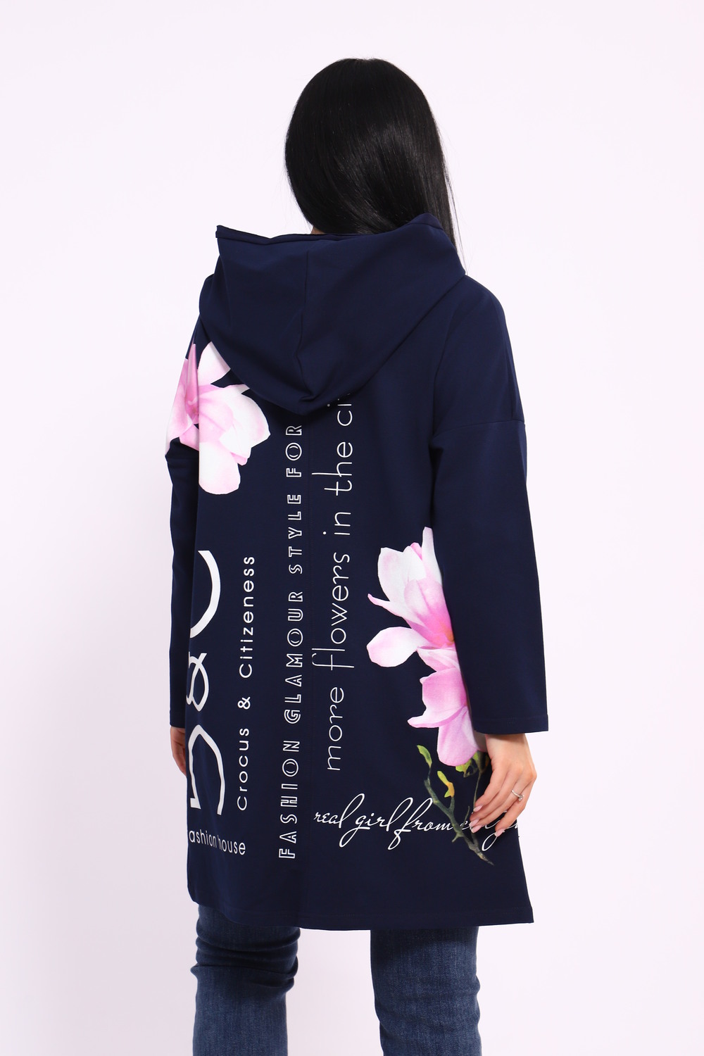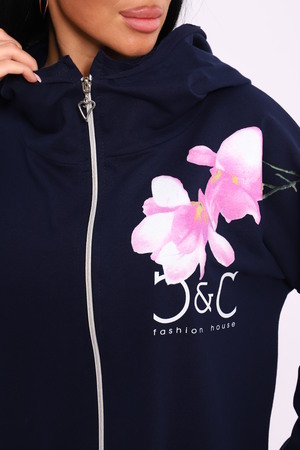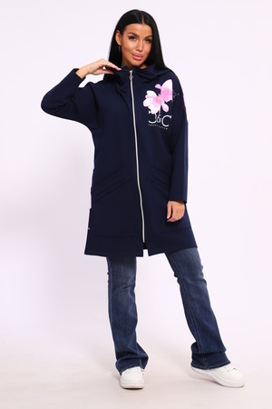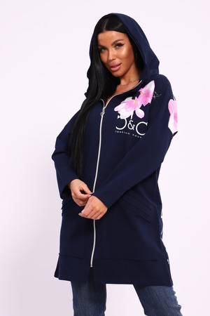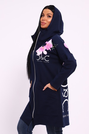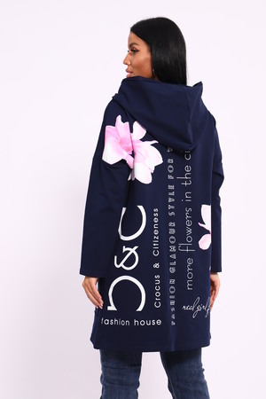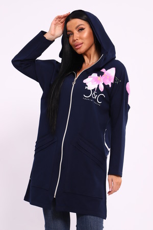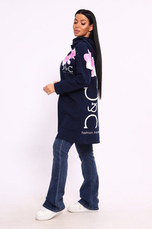 Женская туника из футера. Застегивается на молнию, по бокам карманы, имеется капюшон, принт в виде цветов и надписей, общая длина чуть выше коленей. Размеры от 50 до 64.