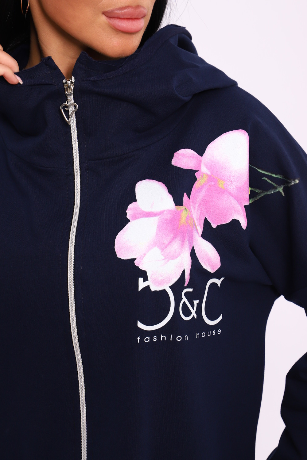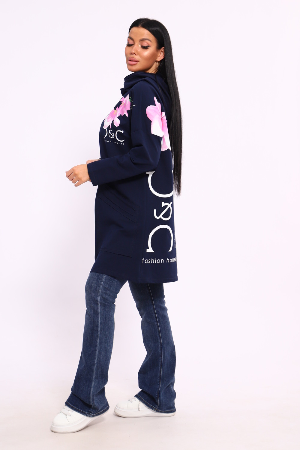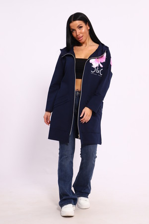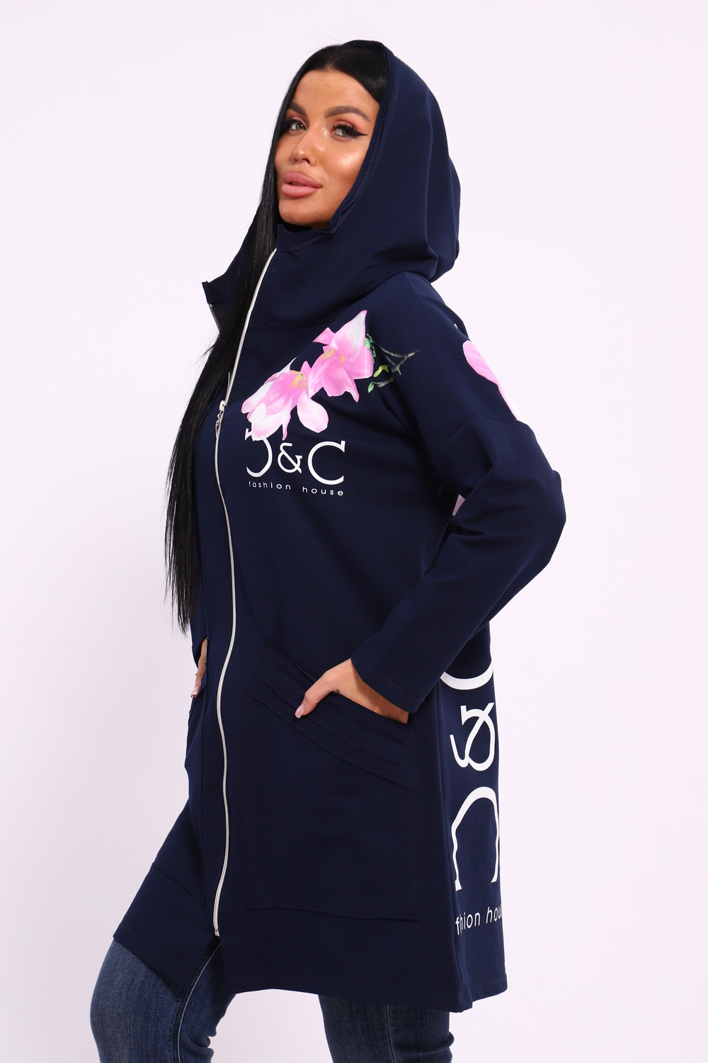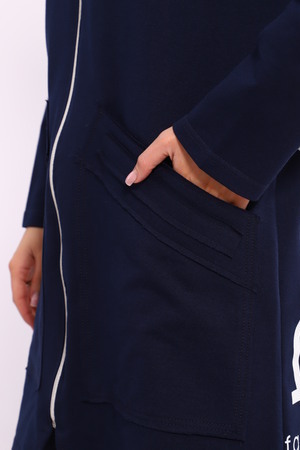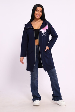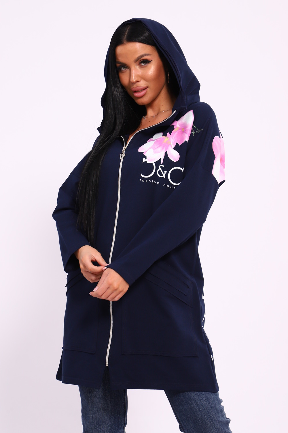 Женская туника из футера. Застегивается на молнию, по бокам карманы, имеется капюшон, принт в виде цветов и надписей, общая длина чуть выше коленей. Размеры от 50 до 64.