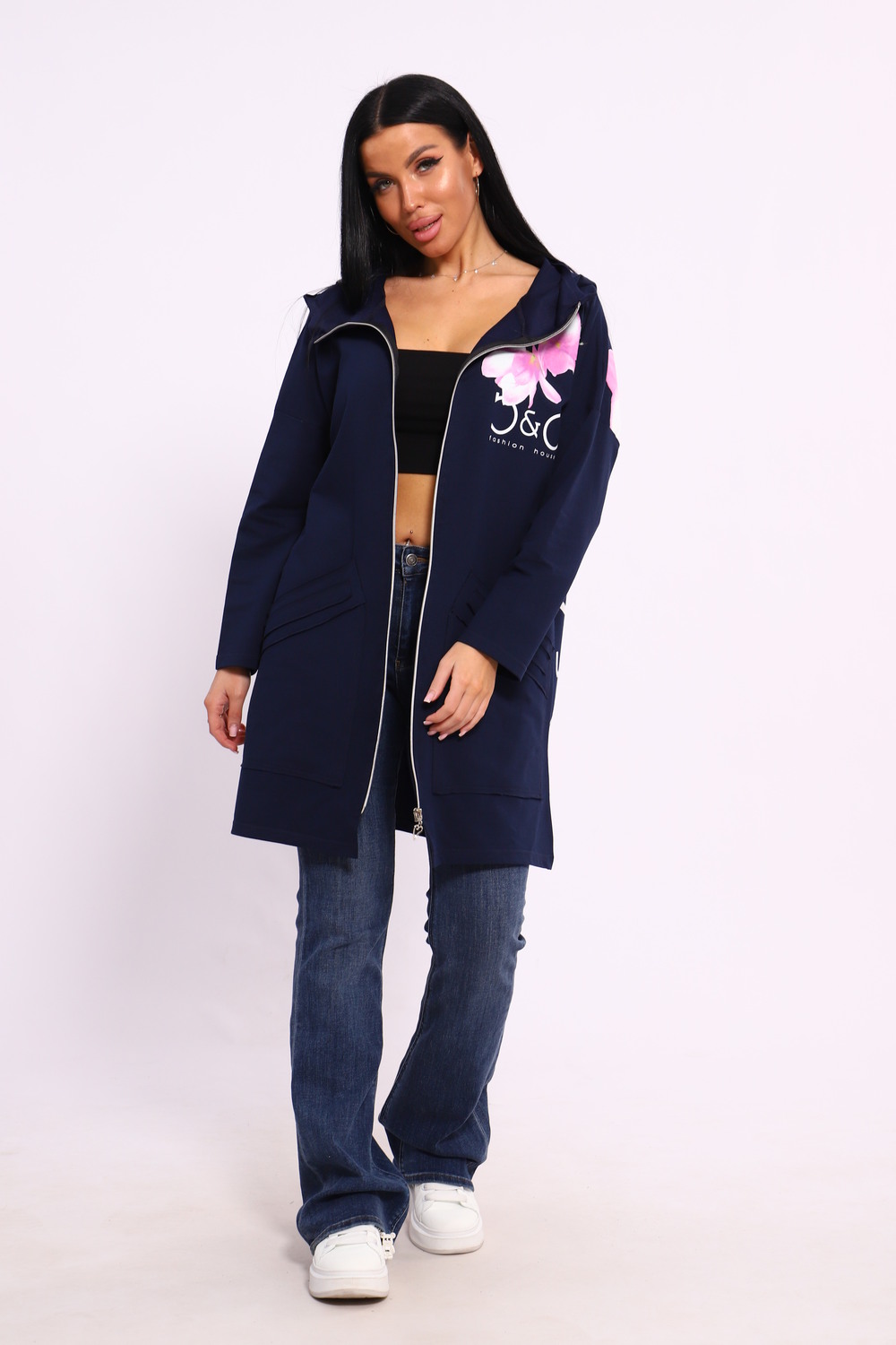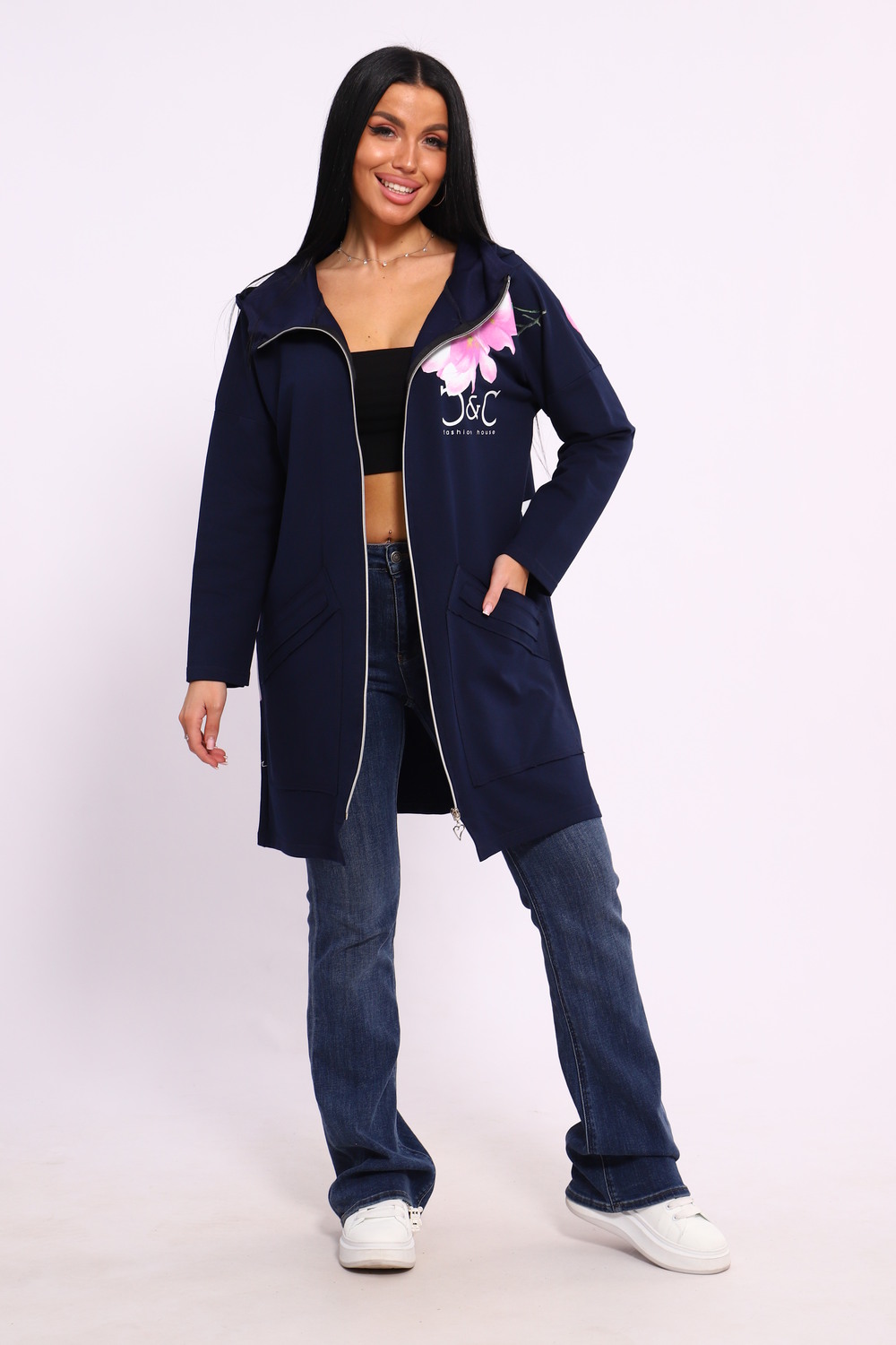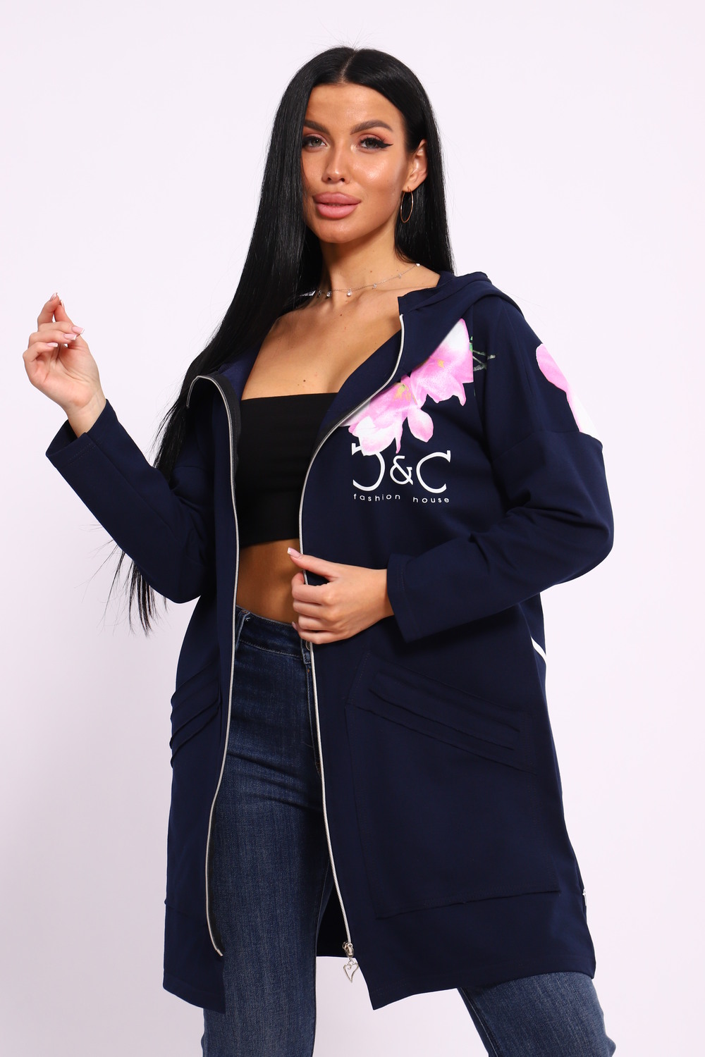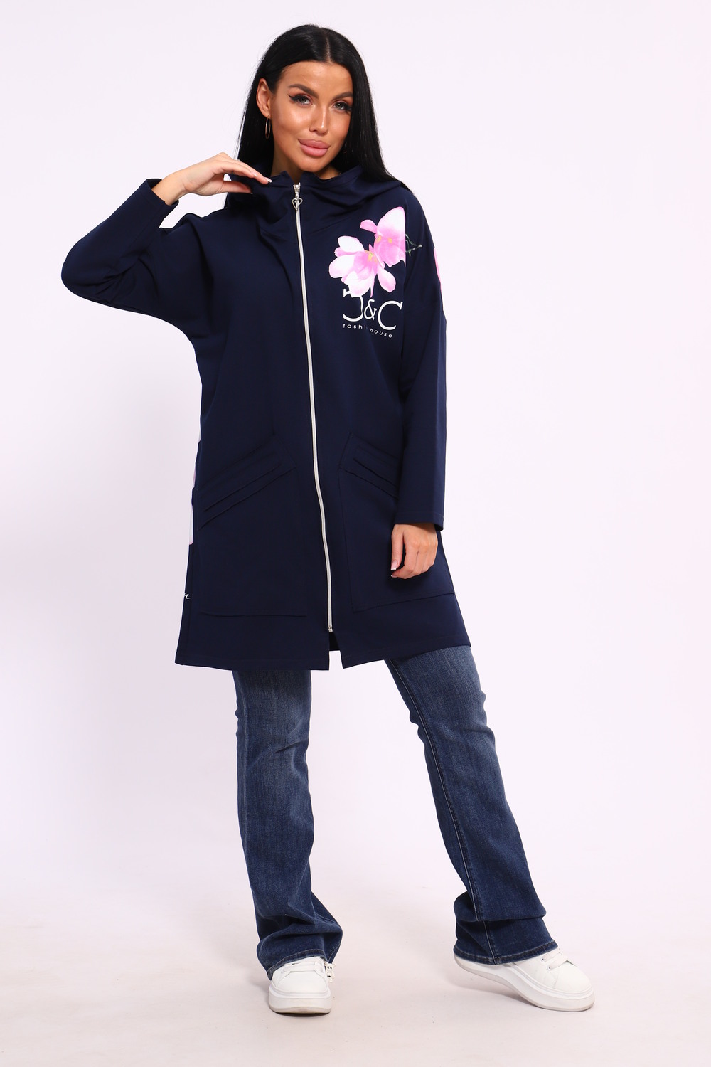 Женская туника из футера. Застегивается на молнию, по бокам карманы, имеется капюшон, принт в виде цветов и надписей, общая длина чуть выше коленей. Размеры от 50 до 64.