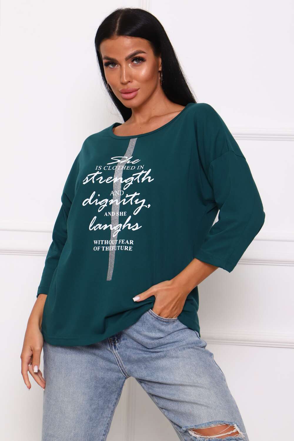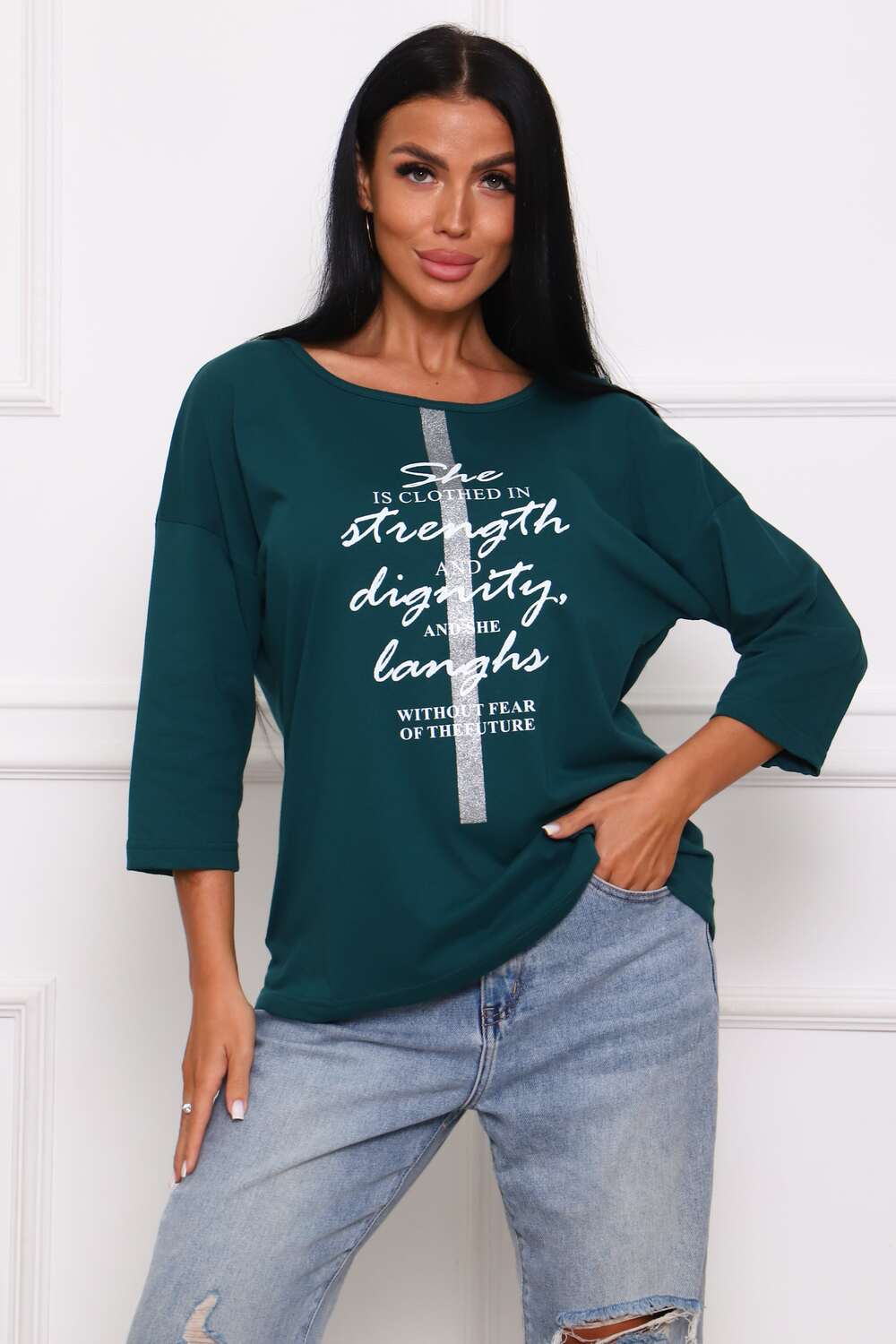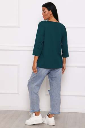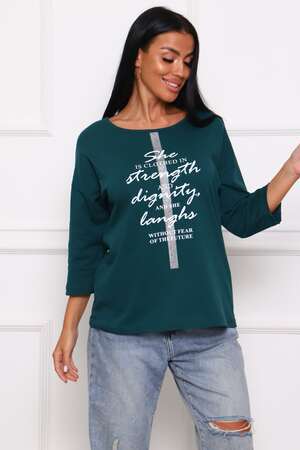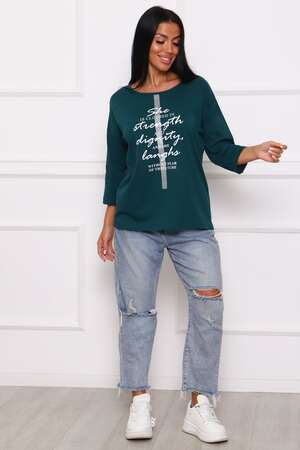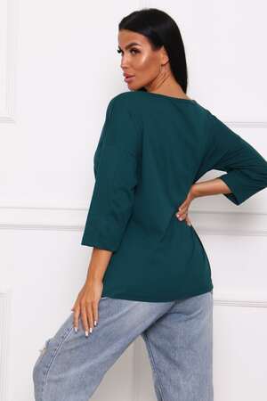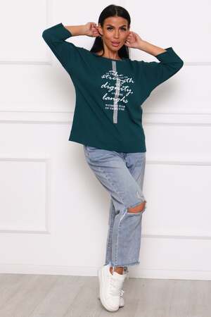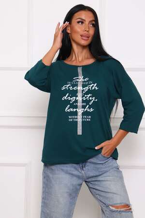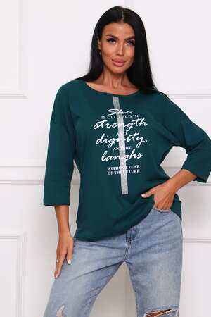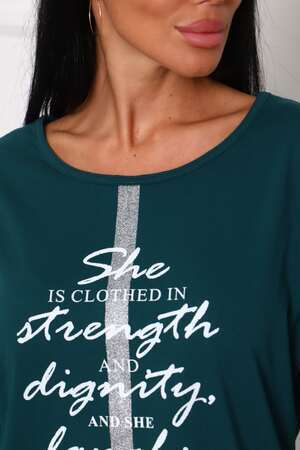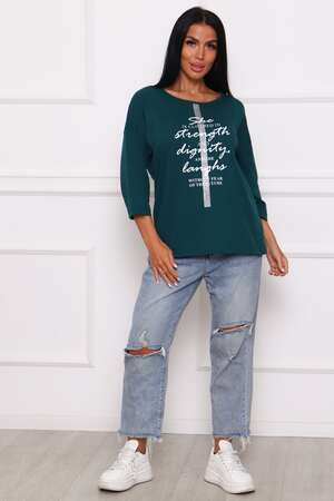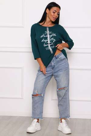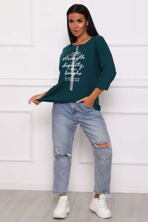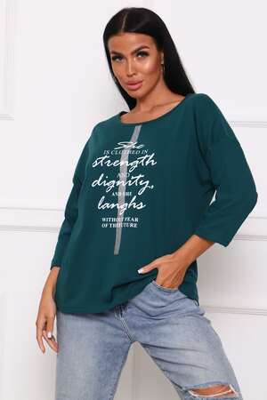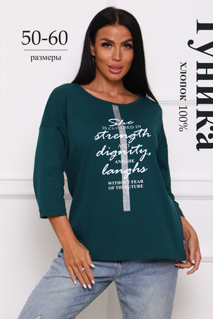 Туника женская. Ткань кулирка, хлопок 100%. Крой свободный, горловина круглой формы, обработана окантовкой. Линия плеч спущена. Длинна рукава 3/4, со швом по локтю. Низ изделия прямой. На полочке принт, шелкография.