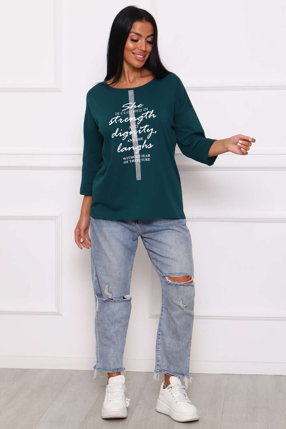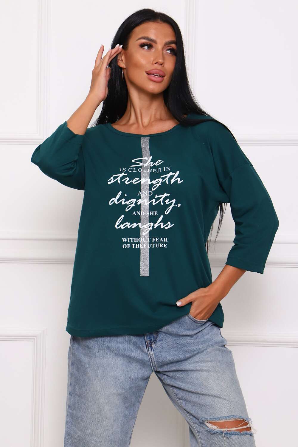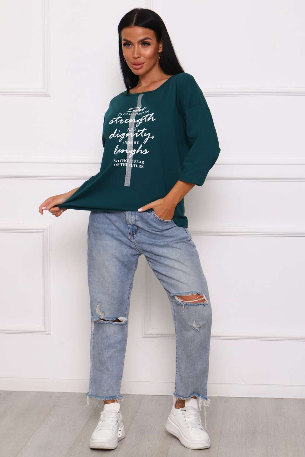 Туника женская. Ткань кулирка, хлопок 100%. Крой свободный, горловина круглой формы, обработана окантовкой. Линия плеч спущена. Длинна рукава 3/4, со швом по локтю. Низ изделия прямой. На полочке принт, шелкография.