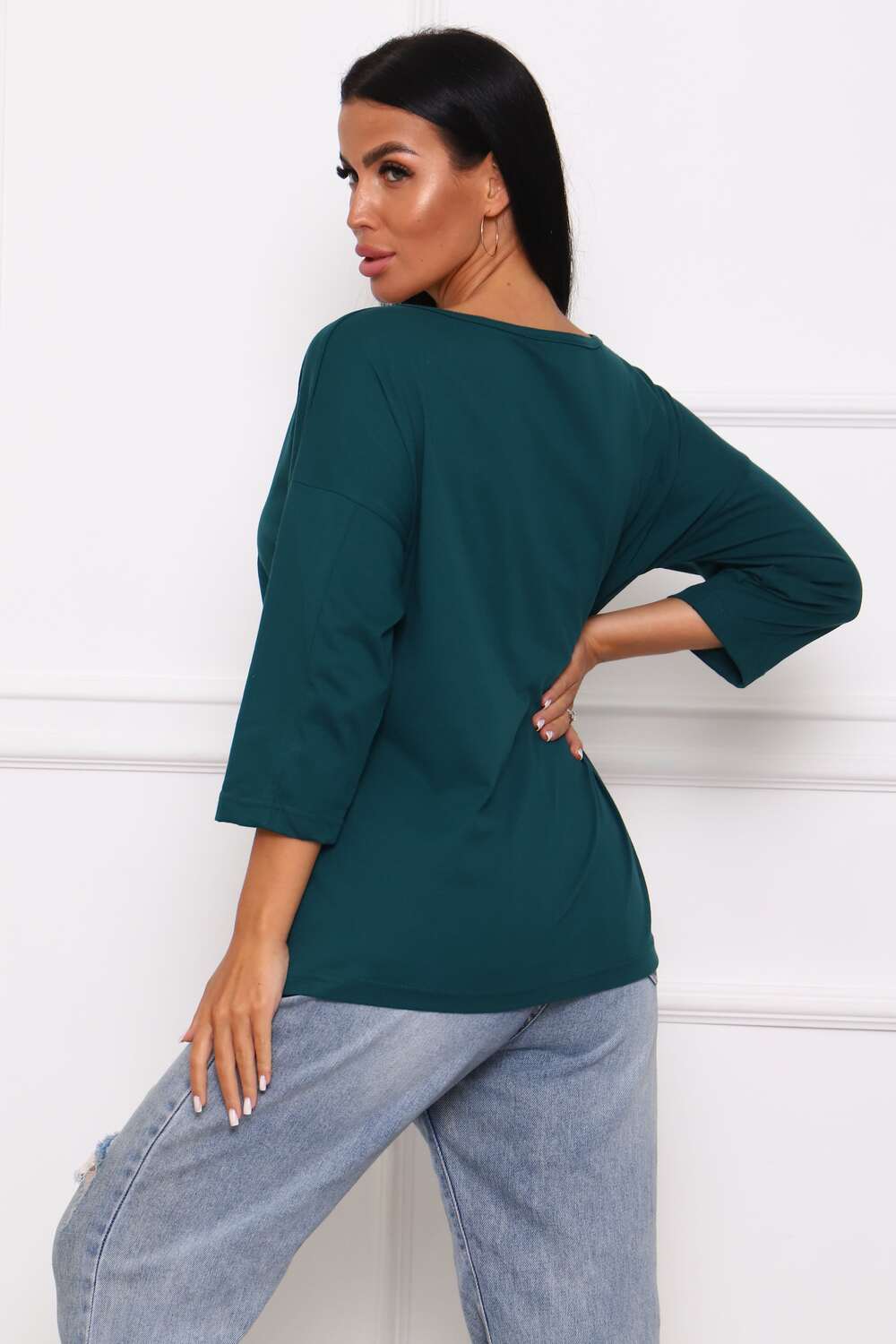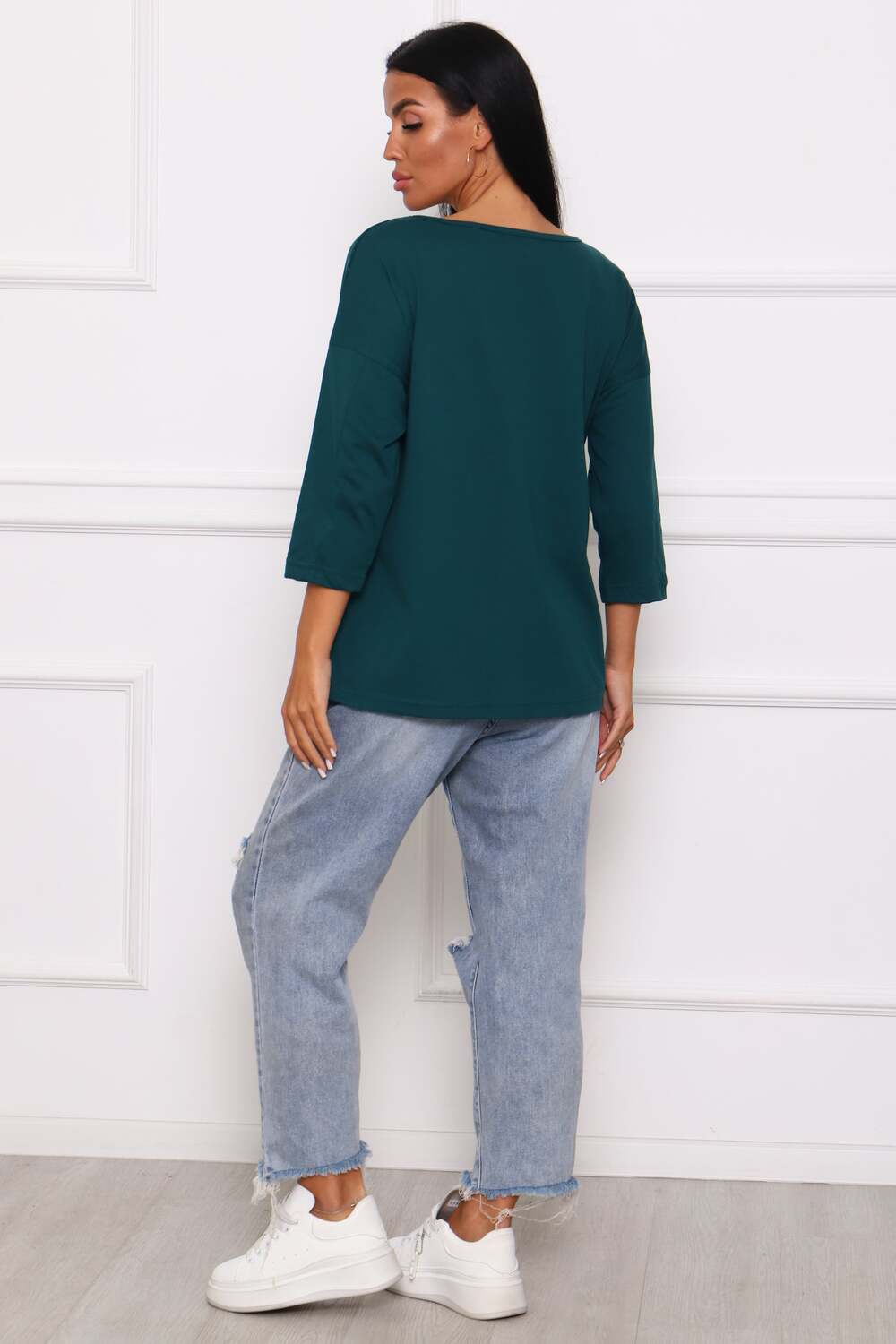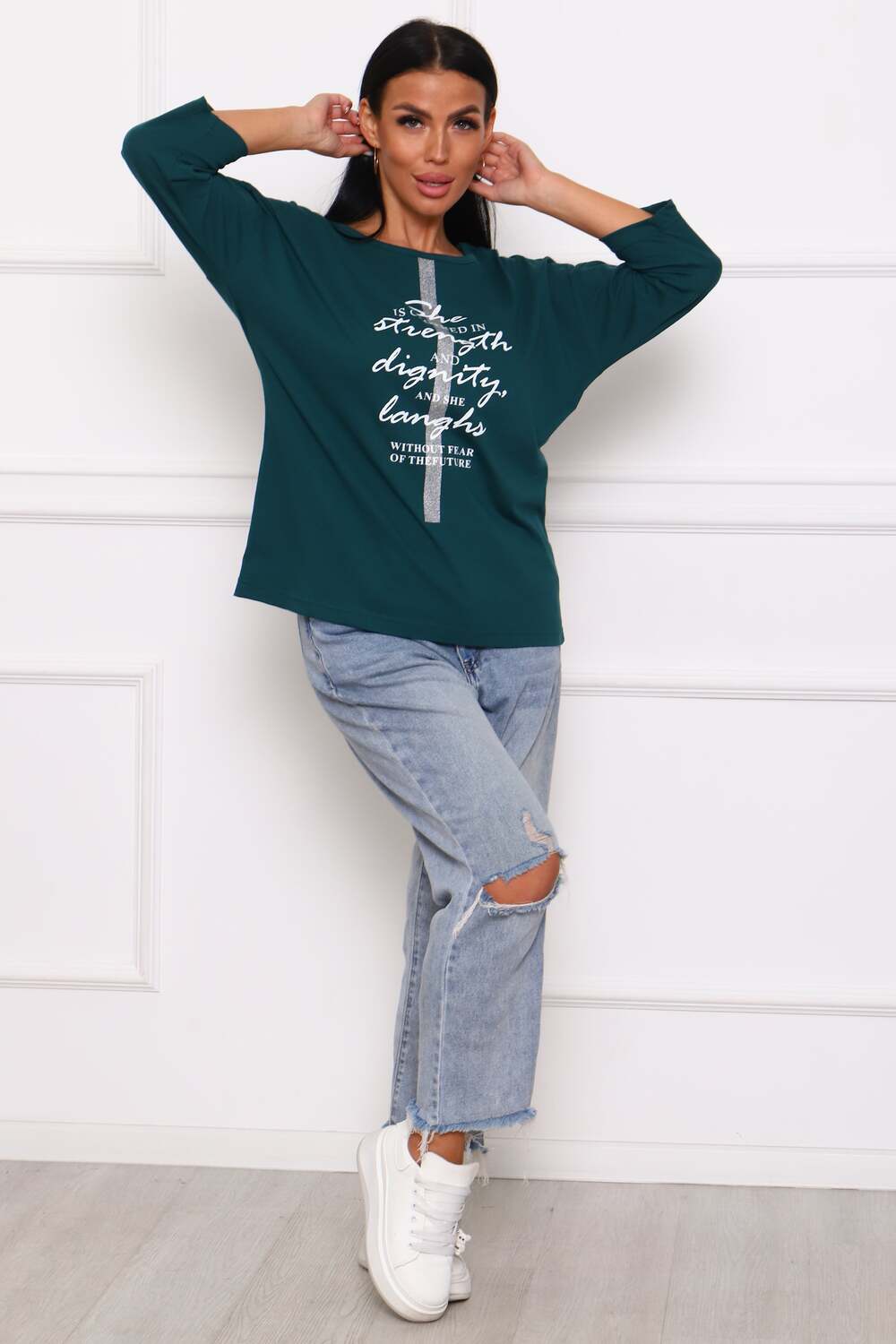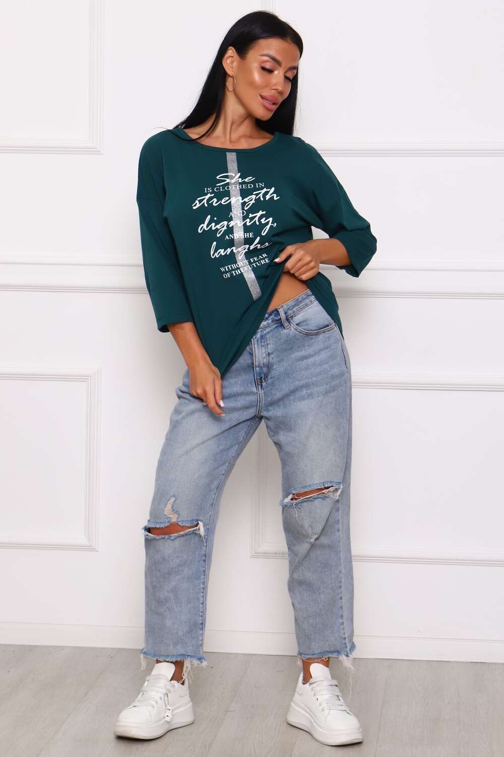Туника женская. Ткань кулирка, хлопок 100%. Крой свободный, горловина круглой формы, обработана окантовкой. Линия плеч спущена. Длинна рукава 3/4, со швом по локтю. Низ изделия прямой. На полочке принт, шелкография.