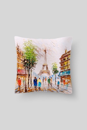 Декоративный чехол-наволочка на подушку Дешанель (40х40см) из полиоксфорда, с потайной молнией. Фотопечать - художественная иллюстрация в теплых тонах с видом на Эйфелеву башню с одной из центральных улиц Парижа