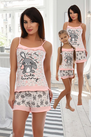 Спальная пижама на бретельках, состоящая из топа и шорт. Низ топа и шорт обработаны отделочными воланами. На полочке расположен принт.