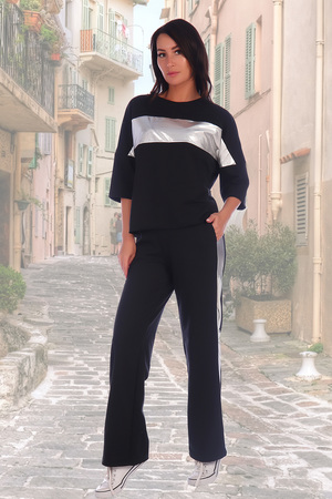 Костюм свободного кроя - кофта с укороченным рукавом и серебряной вставкой. Брюки свободные, прямые, с двумя карманами и серебристыми лампасами