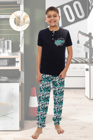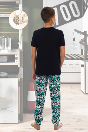 Костюм для мальчика с длинными брюками. Футболка имеет короткий рукав, на полочке присутствует планка с кнопками и принт. Низ рукава и изделия обработаны плоскошовным швом. Брюки на резинке 2,5 см, по низу манжет. Подходит как для сна, так и для отдыха дома. Костюм комбинированный - футболка выполнена из кулирки (хлопок 100%), а для брюк подобрана ткань высокого качества для эластичности швов - кулирка с лайкрой (хлопок 80%, лайкра 20%)