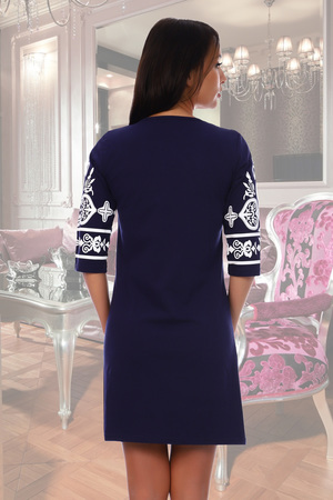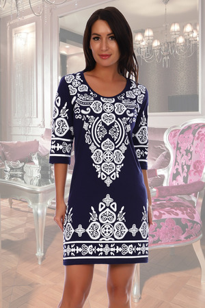 Татьяна Викторовна13.06.2019 в 14:37На объём груди 104 взяла 54 размер село отлично, рисунок скрывает все недочеты фигуры, на рост 160 см длина до колена