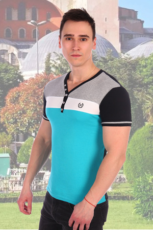 Футболка прямого силуэта с угловым вырезом, украшенным пуговицами. Имеет три цвета ткани, передняя планка украшена печатью. Цвет футболки для подбора определяется цветом планки с печатью.