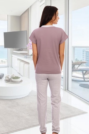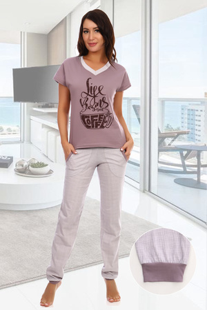 Домашний костюм Френси включает в себя футболку с коротким рукавом-реглан и длинные брюки с манжетом. Оба предмета выполнены из кулирки. Однотонная майка дополнена интересным принтом. Брюки с карманами.