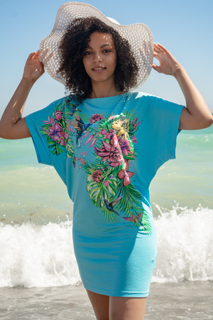 Красивая, универсальная, лёгкая туника свободного фасона. Подходит как для дома, так и для пляжного отдыха. Принт в виде тропической композиции с птичками колибри. Рисунок расположен по диагонали. Длина изделия до середины бедра, свободный, спущенный рукав. Продуманный крой обеспечивает свободу движений и комфорт.