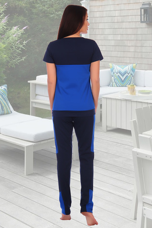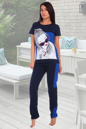 Домашний костюм состоит из футболки и брюк. Футболка с отрезной кокеткой, горловина обработана кантом, по переду принт, по низу пояс. Кокетка, рукава и пояс из фулайкры. Брюки прямого силуэта, в боковых швах широкий лампас, состоящий из двух цветов.