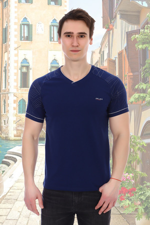Мужская футболка выполнена из кулирки с лайкрой. V-образная горловина, короткие рукава с рисунком, на груди принт в виде небольшой надписи. Цветовая гамма представлена тремя цветами - ментол, коралл, темно-синий.