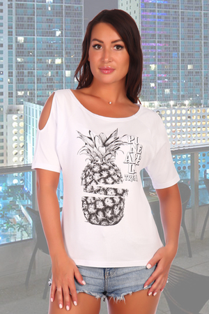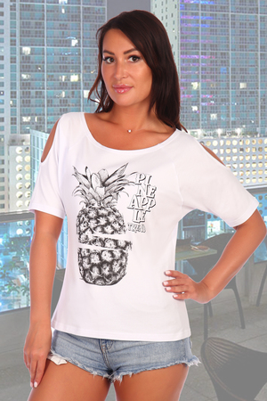 Стильная футболка прямого силуэта с коротким рукавом и круглым вырезом горловины выполнена из мягкого приятного к телу трикотажа. Кокетливый вырез на плече и оригинальный контрастный принт освежают образ и придают ему эксклюзивности.