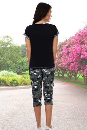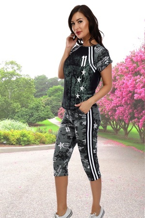 Комплект состоит из футболки и бриджей. Бриджи на резинке, средней длины, с карманами, с лампасами контрастного цвета вдоль боковых швов. Футболка прямого силуэта, длиной до середины бедра. Рукав цельнокроеный короткий, на манжете. На полочке, из отделочного полотна, расположены симметричные кокетки, из основного полотна, и лампасы контрастного цвета. Горловина и карманы на бриджах обработаны бейкой из основного полотна.