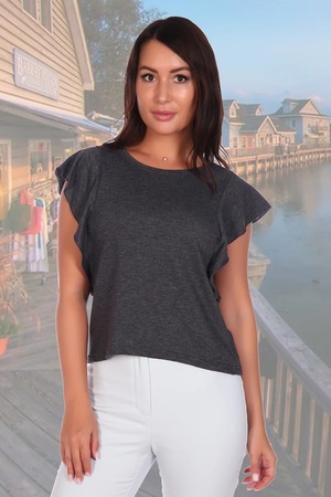 Замечательная модная футболка с эффектными воланами спереди и на спине. Благодаря воланам футболка быстро станет стильной вещью. Она будет легко сочетается с многими вещами Вашего гардероба.