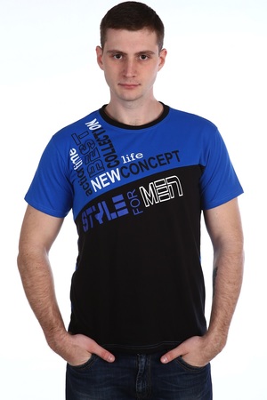 Мужская футболка, комбинированная из тканей разных расцветок. На полочке печать, округлый вырез горловины
