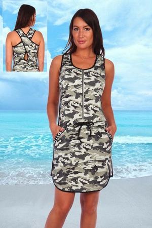 Туника в спортивном стиле, полуприлегающего силуэта, с округлой горловиной, без рукавов, на молнии, с фигурным низом. На полочке карманы обработаны декоративной тесьмой. Объем по линии талии на полочке регулируется шнуром-стяжкой. Вдоль боковых швов туники расположены вставки с лампасами. В верхней части спинки перекрещивающиеся бретели образуют фигурный вырез. Горловина, проймы, низ изделия обработаны бейкой из отделочного полотна.