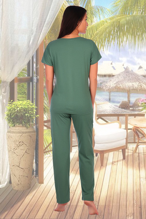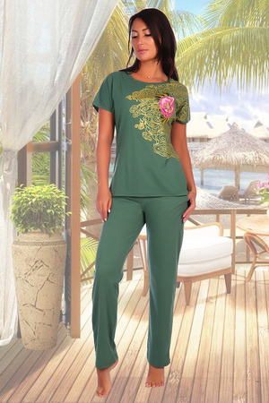 Костюм женский из кулирки брюки+футболка. Брюки прямые, на резинке, с карманами; футболка со спущенным рукавом и красивым золотым принтом