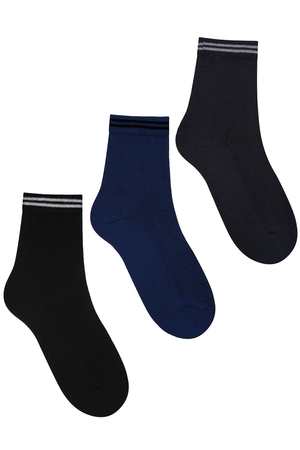 Набор спортивных мужских носков. В комплекте 6 пар: черный, индиго и серый. Сверху вывязаны полоски, длина средняя. С изнаночной стороны плюшевые по длине стопы. В продаже имеются аналогичные подростковые носки Сезон