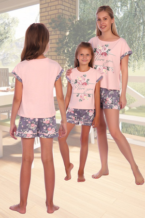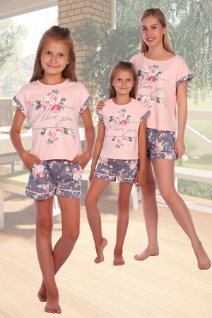 Костюм женский футболка+шорты. Футболка из кулирного полотна розового цвета. Прямого силуэта. На груди принт. Рукав цельнокроенный с манжетом на отворот из отделочного материала. Горловина формы "лодочка" обработана с помощью окантовки. Низ- подгибка.