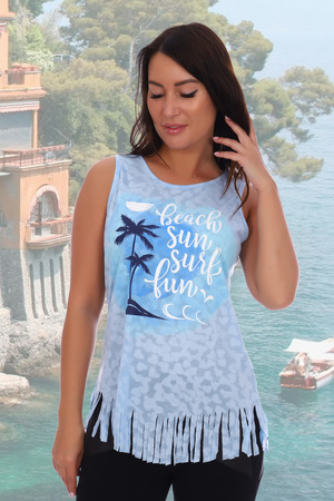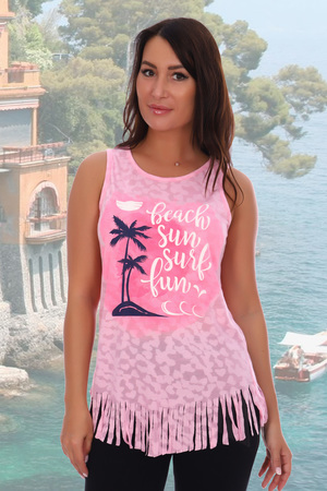 Майка молодежная с рваной бахромой свободного силуэта. Печать летного рисунка на изделии.