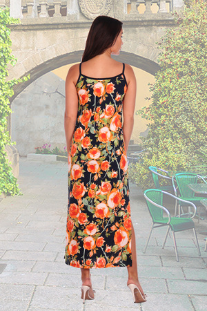 Длинный сарафан с двумя разрезами в боковых швах. На лифе сборка, которая может регулироваться с помощью двух завязок.