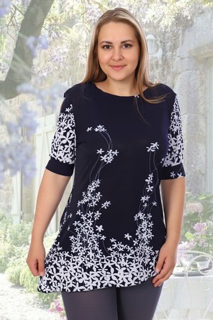Туника свободного кроя. Вырез горловины отделан кантиком, рукав 3/4 на манжете. Низ изделия асимметричный — удлинен справа.