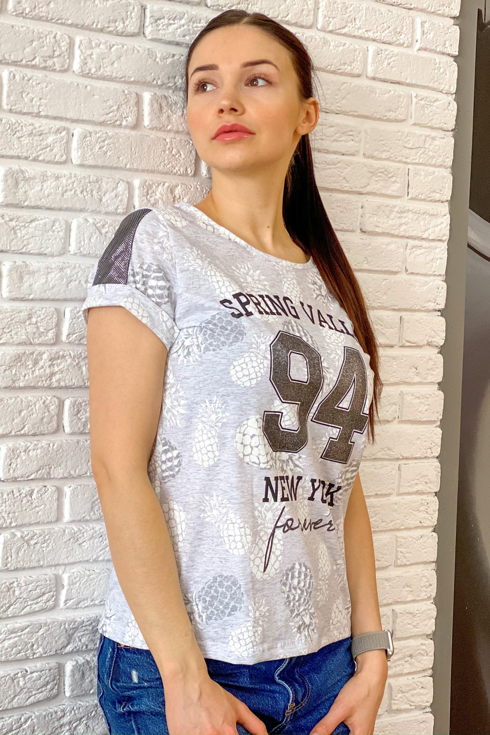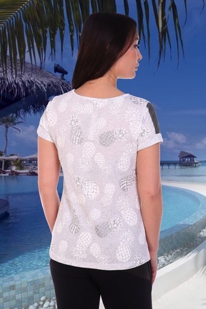 Футболка полуприлегающего силуэта, с округлой горловиной, длиной до середины бедра. Рукав втачной, короткий, с манжетом и вставкой из отделочного полотна. Горловина обработана бейкой из основного полотна.