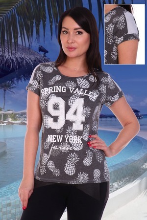 Футболка полуприлегающего силуэта, с округлой горловиной, длиной до середины бедра. Рукав втачной, короткий, с манжетом и вставкой из отделочного полотна. Горловина обработана бейкой из основного полотна.