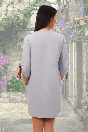Платье женское. Рукав со спущенным плечом, забран тесьмой. Карман "кенгуру" с отделкой тесьмой. Силуэт "бочонок". Низ изделия фигурный. На груди выполнен принт из страз.