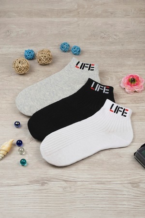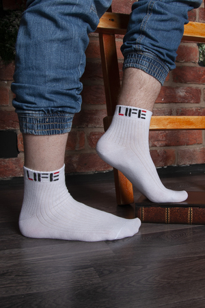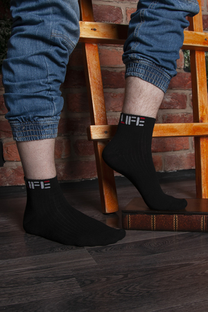 Набор мужских носков. По верху вывязаны полосы, на резинке надпись. В упаковке 6 пар — по 2 пары каждой расцветки