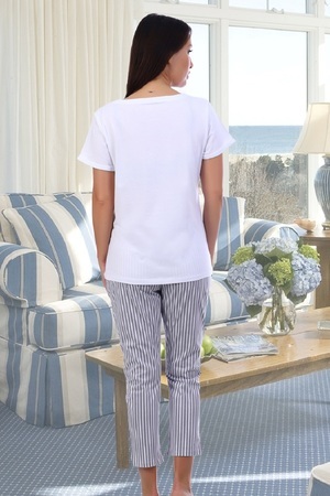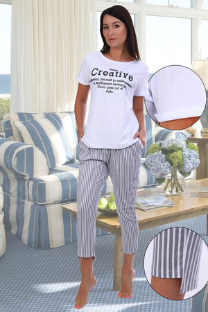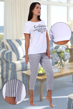 Молодежный костюм, состоящий из футболки и брюк. Футболка с печатью на полочке, с коротким рукавом. Брюки 7/8 с прорезными карманами в боковых швах, задние половинки брюк чуть длиннее передних.