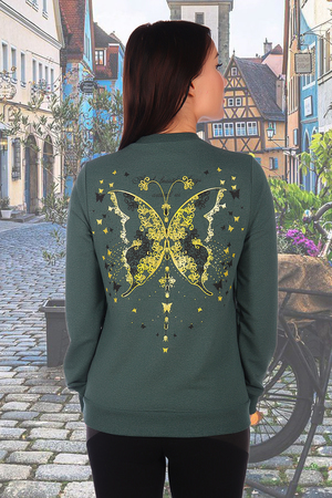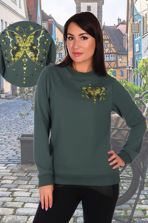 Трикотажный свитшот из меланжированного футера с лайкрой. На спине красивый принт в виде большой бабочки. На полочке принт в виде маленькой бабочки на груди. Свободная посадка даёт возможность сочетать его с различными предметами гардероба, формируя привлекательные повседневные образы.