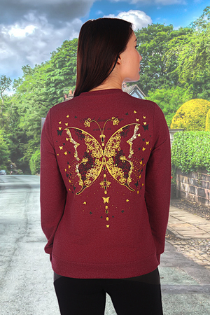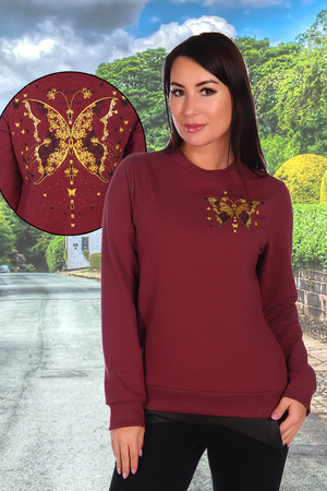 Трикотажный свитшот из меланжированного футера с лайкрой. На спине красивый принт в виде большой бабочки. На полочке принт в виде маленькой бабочки на груди. Свободная посадка даёт возможность сочетать его с различными предметами гардероба, формируя привлекательные повседневные образы.
