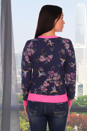 Кофта женская на молнии, выполнена из набивного футера, отделана яркими манжетами по низу изделия, горловине, рукавах, так же отделан вход в карманы.