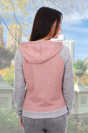 Толстовка молодежная укороченная из трикотажного жаккардового полотна, рукава и накладные карманы из гладкого трикотажа. Манжеты и низ толстовки из кашкорсе. В капюшоне широкий шнур.