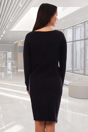 Классический женский костюм выполнен из ткани мариона в клетку и черного футера. Приталенная юбка на резинке с асимметричным подолом гармонично сочетается с кофтой свободного силуэта. Кушак в боковом шве юбки, проходящий через широкий люверс, фиксирует размер талии, карман в клетку на черном фоне кофты дополняет образ элегантного костюма.