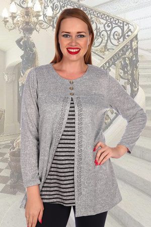 Оригинальная теплая туника 2 в 1, с полосатой вставкой. Полукруглый вырез, длинные рукава. Спереди украшение в виде пуговки.