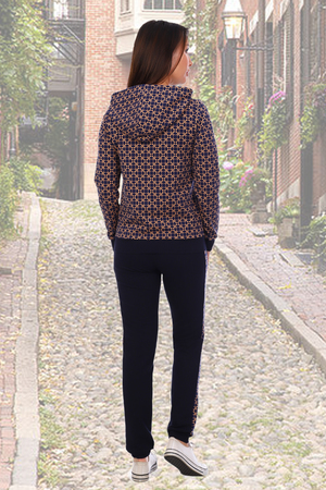 Молодежный спортивный костюм выполнен из красивой принтованной ткани с хорошей растяжимостью. Классическая толстовка на молнии, с капюшоном, рукава и низ брюк на манжете. В боковых швах толстовки кармашки. Брюки прилегающего силуэта на резинке, без карманов.
