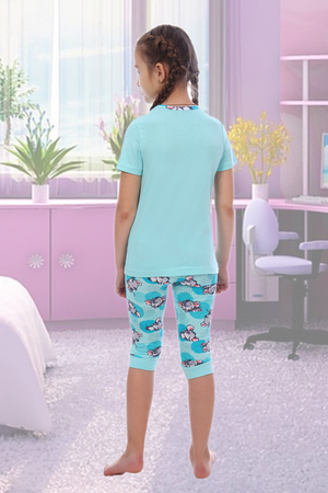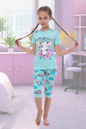 Костюм детский. Футболка с коротким рукавом, верх переда отделан декоративными вставками. бриджи на резинке, низ отделан манжетой. На футболке принт "мышка".