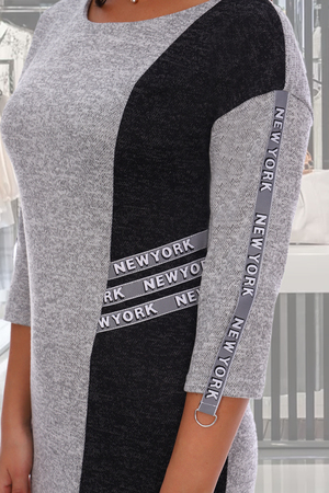 Оригинальное контрастное платье выполнено из мягкого приятного к телу трикотажа джерси. Модель приталенного силуэта имеет спущенный рукав 3/4 и длину до колена. Рукав и темно-серая вставка декорированы отделочной тесьмой. Платье выглядит строго и лаконично, но в тоже врямя женственно и утонченно. Модель отлично сочетается со спортивными аксессуарами.