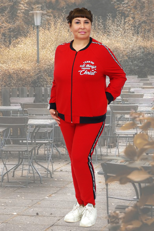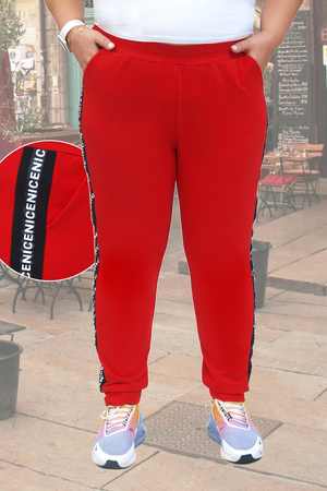 Спортивные брюки выполнены из трикотажного эластичного полотна, имеют комфортый пояс на резинке. По боковым швам расположены лампасы с декоративной тесьмой, благодаря которым фигура выглядит стройнее. Низ брюк обработан притачной манжетой.