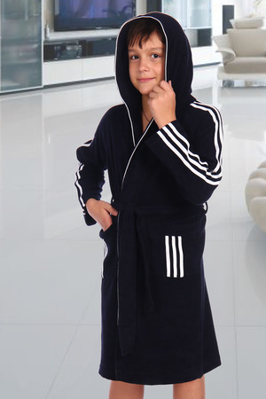 Детский халат на запах, на поясе. С капюшоном, длинным рукавом, двумя накладными карманами и контрастной отделкой в виде лампасов. Длина изделия ниже колена