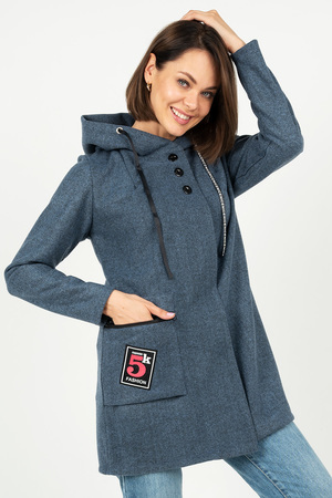 Универсальный жакет из ткани эко-кашемир, полуприлегающего силуэта, с застежкой на 7 пуговицах (3 пуговицы сквозные, 4 супатные) и капюшоном, корректирующимся корсажной лентой. С накладным карманом на молнии, декорированный современным шевроном. Жакет имеет длинный рукав, длина изделия ниже бедра.