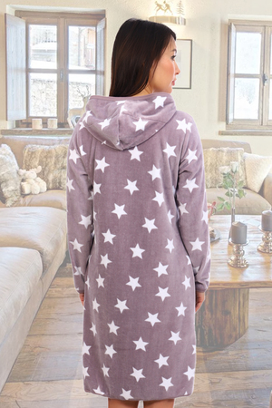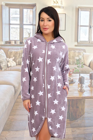 Халат велюровый на молнии, с капюшоном, по бокам карманы. Отделка - кант в цвет основной ткани. Уютный и теплый халат для отдыха, спокойной расцветки цвета какао, набивка - белые звезды