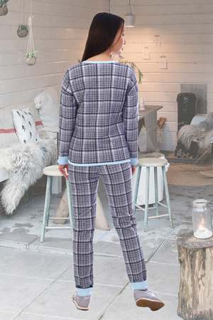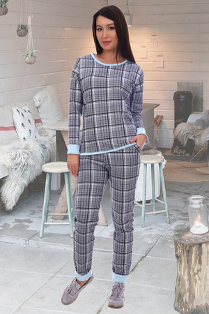 Костюм женский из футера состоит из кофты и брюк. Кофта приталенного силуэта, рукав спущенный длинный, горловина и низ изделия обработаны обтачкой из отделочной ткани. Брюки прямые, верх с поясом на резинке, боковые карманы обработаны обтачкой. Низ брюк и низ рукава обработаны манжетом с загибом из отделочной ткани
